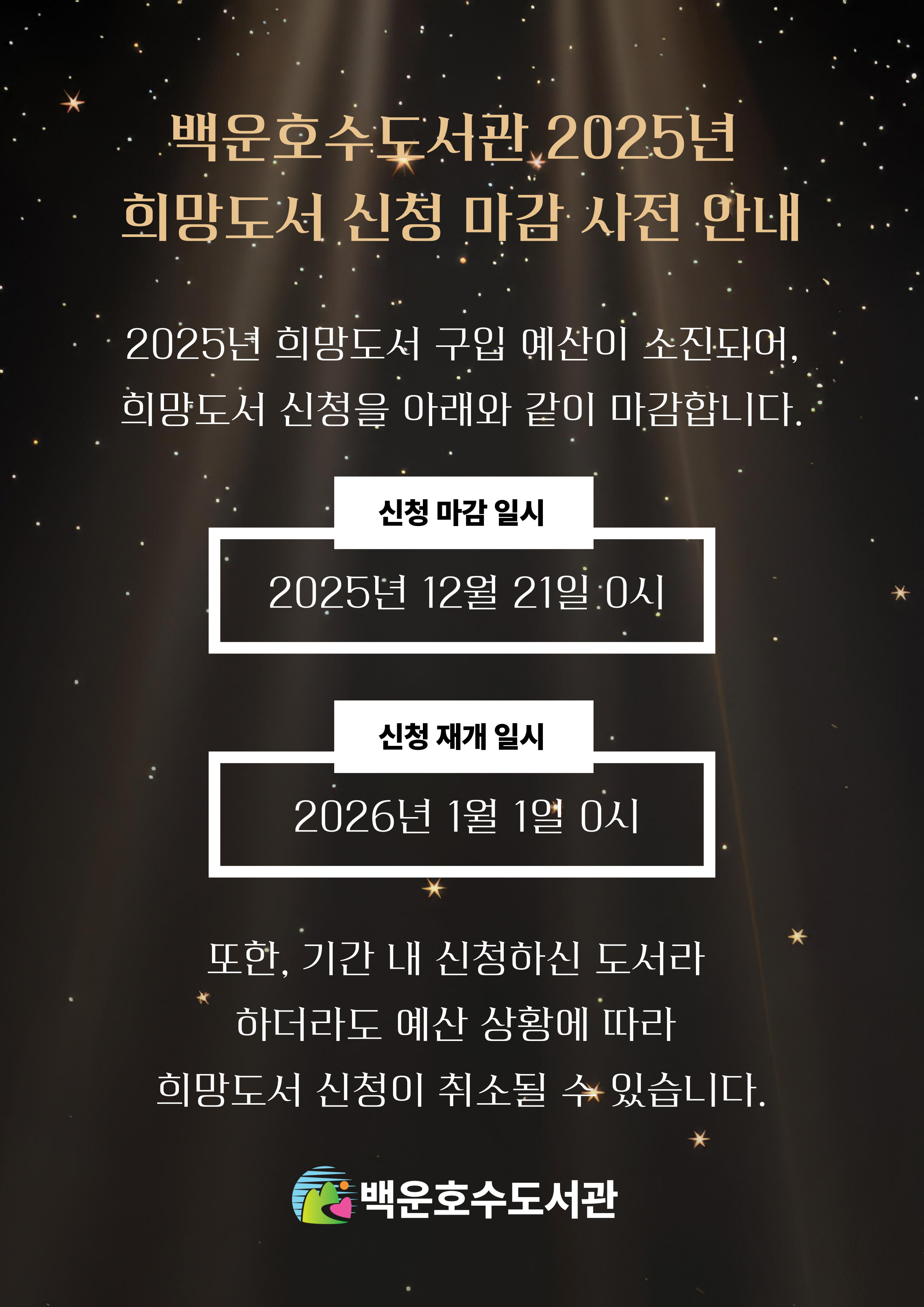[백운호수]백운호수도서관 2025년 희망도서 신청 사전 마감 안내