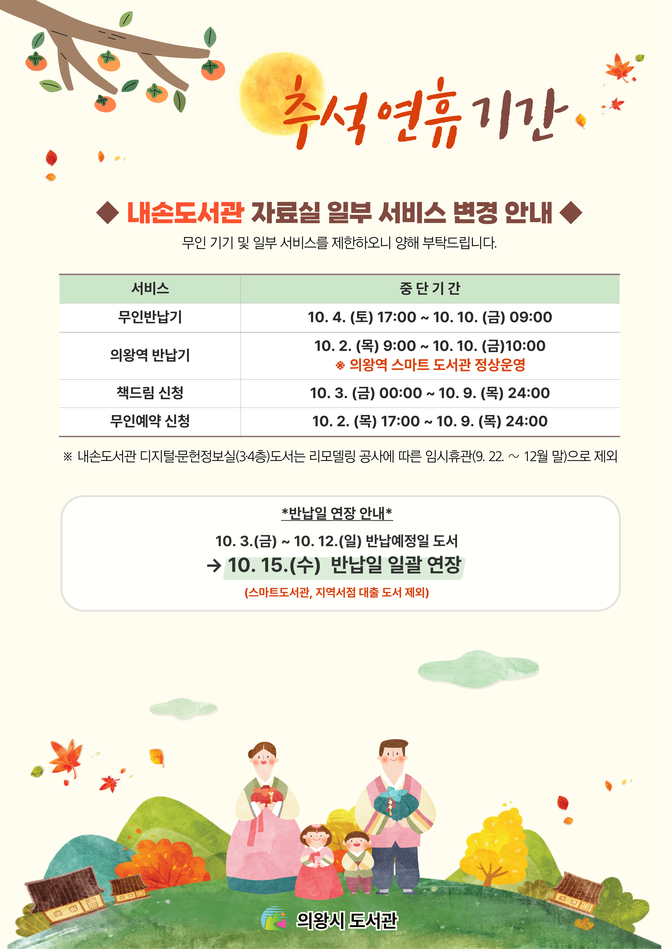 2025년 추석 연휴 내손도서관 자료실 일부 서비스 변경 운영 안내