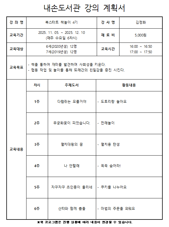 [내손]북스타트 책놀이 프로그램 4기(만 5세, 2020년생)