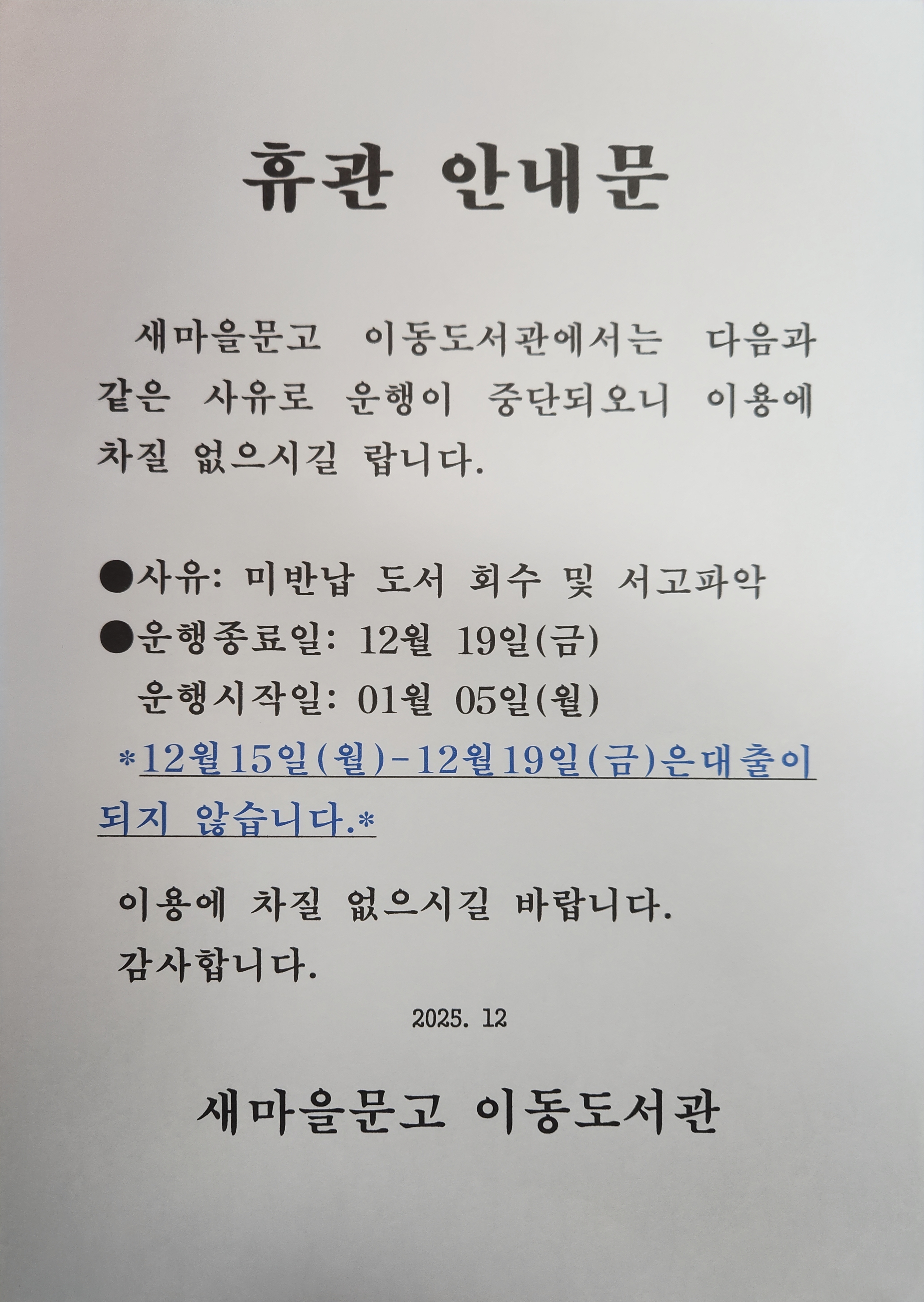 이동도서관이 미반납 도서 회수 및 서고 파악으로 2025. 12. 19.(금)~2026. 1. 4.(일)까지 휴관하오니, 이용에 참고하시기 바랍니다.