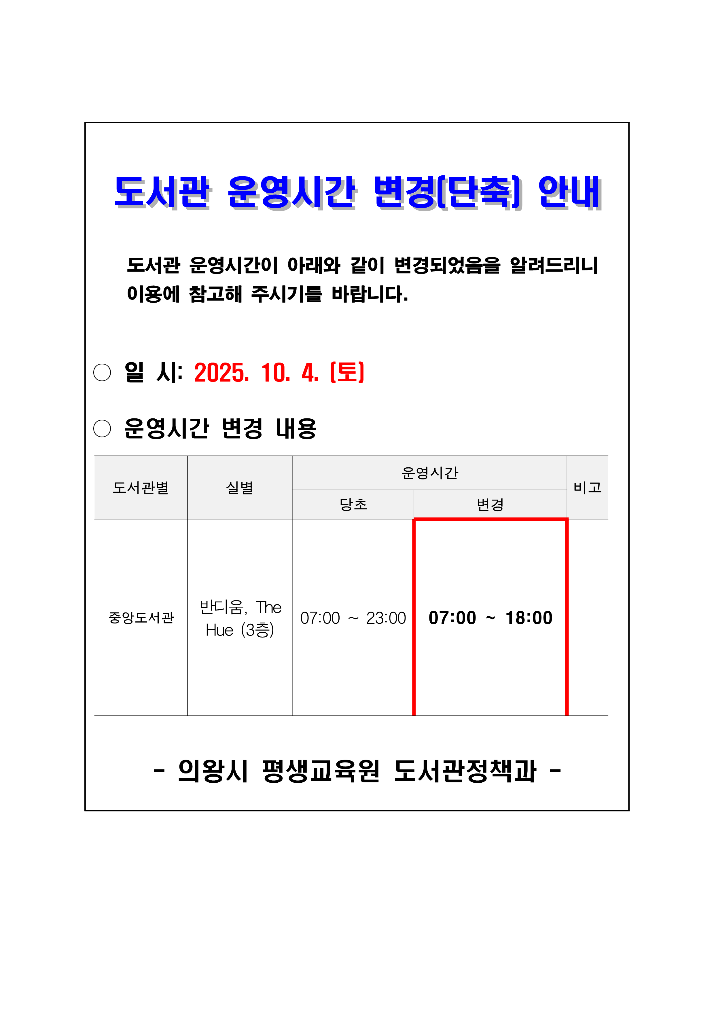 2025. 10. 4.(토) 중앙도서관 반디움, The Hue 단축 운영 안내