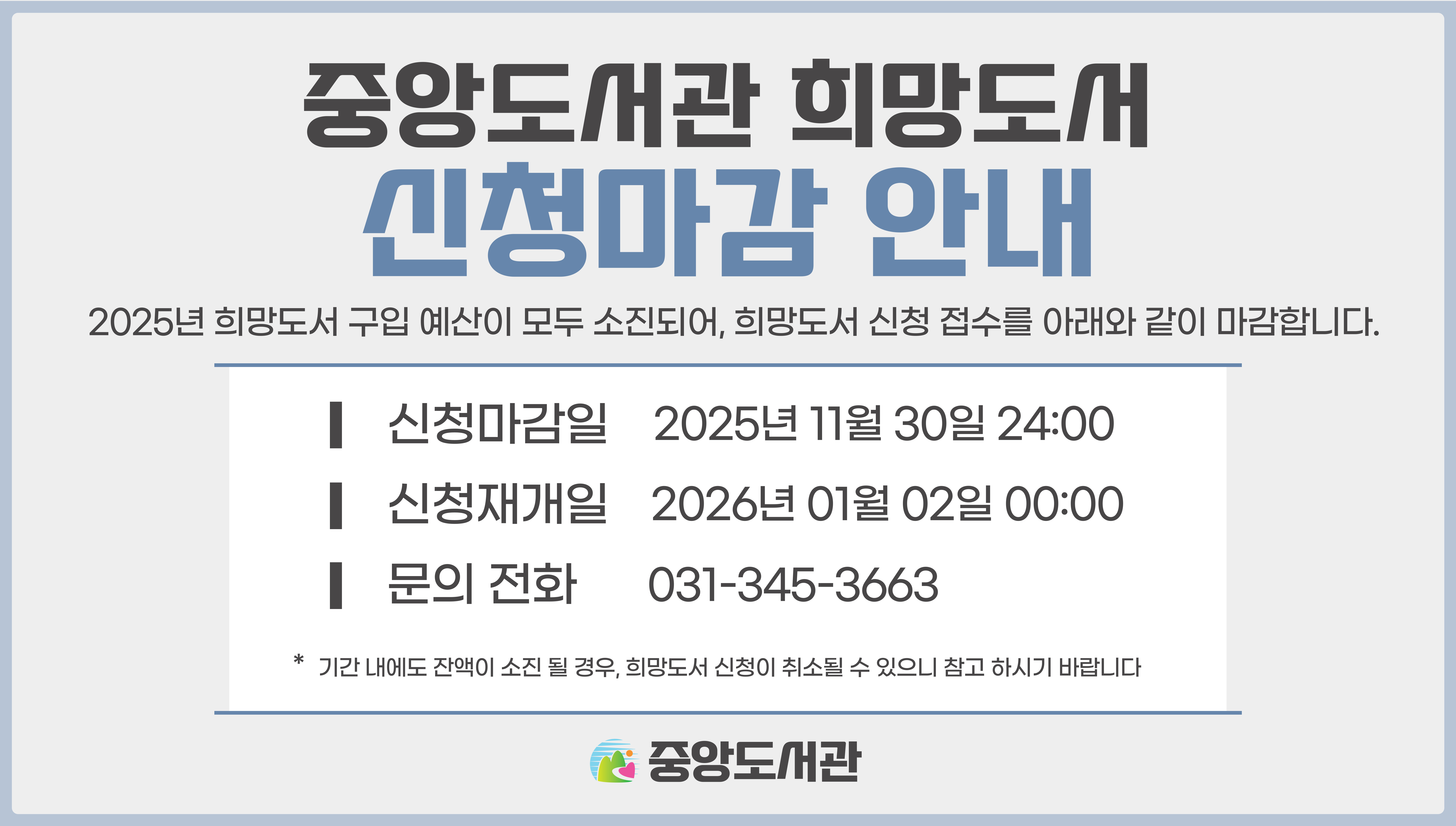 중앙도서관 희망도서 신청마감 안내