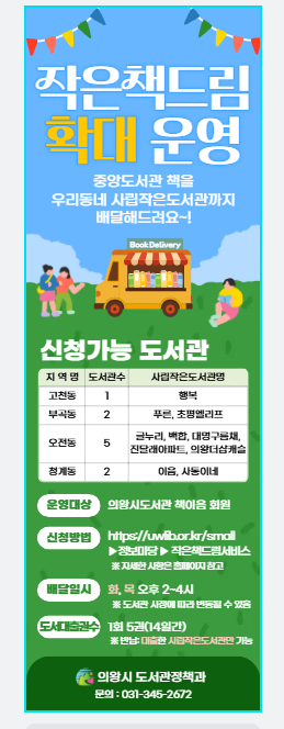 2.추가대상도서관 : 의왕더샵캐슬작은도서관(의왕시 어내들로5 ), 의왕진달래아파트작은도서관(의왕시 호성로64 관리실 및 노인정지하1층)