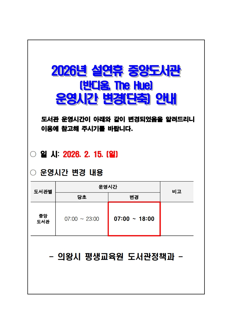2026년 설연휴 중앙도서관(반디움, The Hue) 운영시간 단축 안내