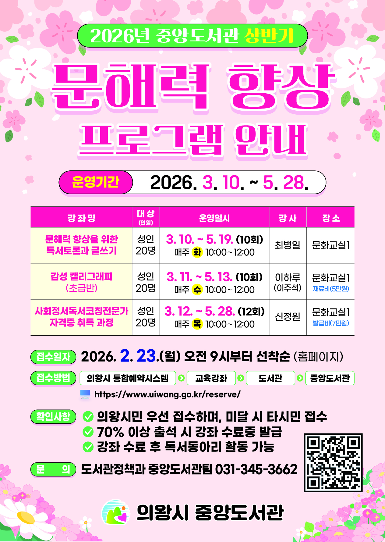 ○ 접수방법: 의왕시 통합예약시스템 ▶교육·강좌 ▶도서관 ▶중앙도서관