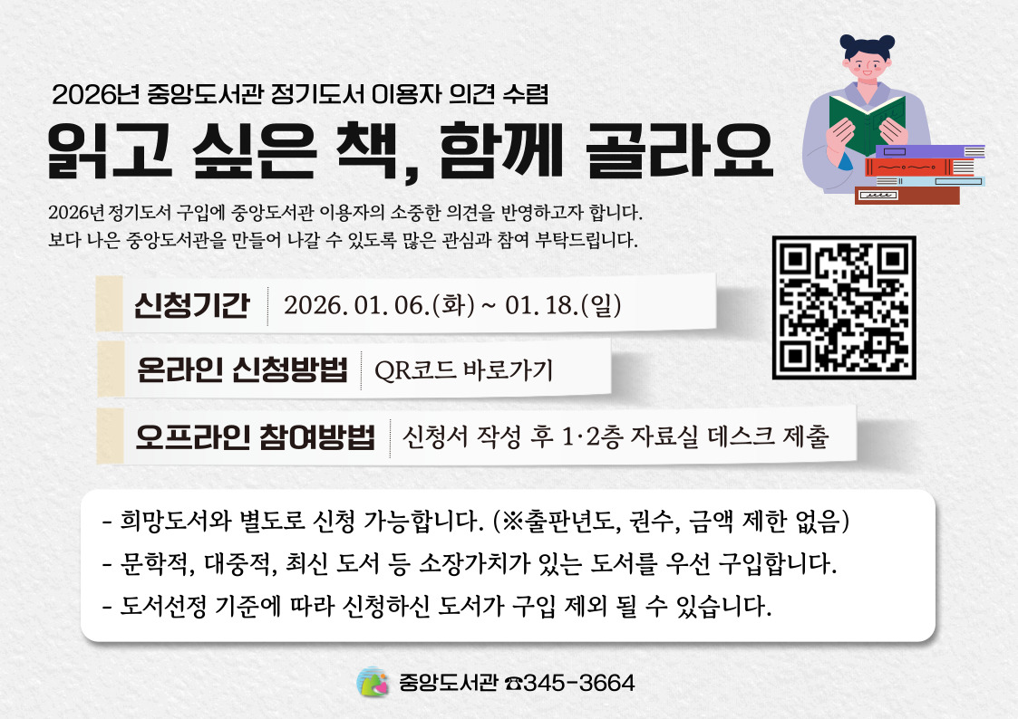 2026년 정기도서 구입에 중앙도서관 이용자의 소중한 의견을 반영하고자 합니다.