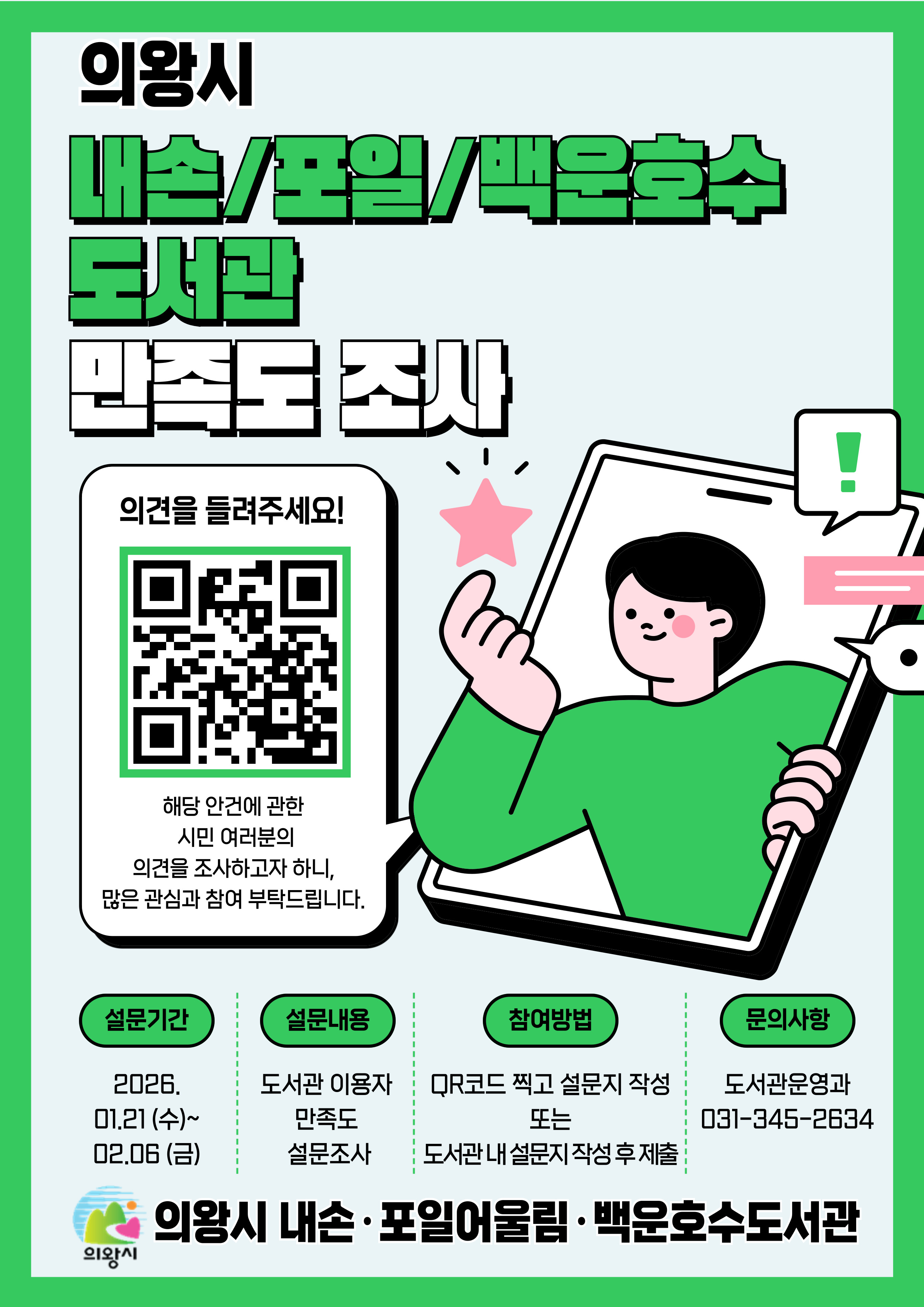 2025년 내손·포일어울림·백운호수도서관 이용자 인식 및 만족도 조사를 실시합니다!