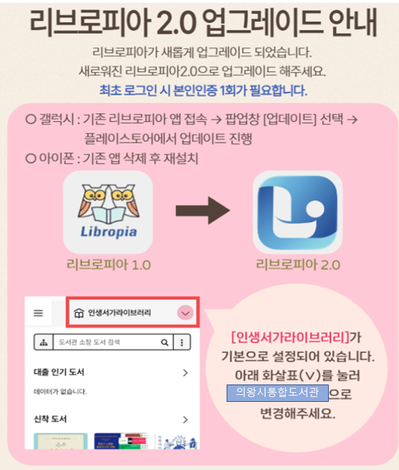 리브로피아 2.0 업데이트 과정에서 일시적인 오류가 발생하여 2월 업그레이드 이후 상호대차 등 일부서비스가 안되었습니다. 그동안 서비스 이용에 불편을 드려 죄송합니다.